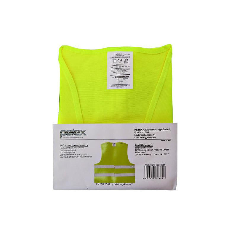 Светлоотразителна аварийна жилетка PETEX, задължителна за всеки автомобил. Изработена съгласно DIN EN 20471 - международен стандарт, който налага изисквания за видимо работно облекло на служители в зони с висок риск.
