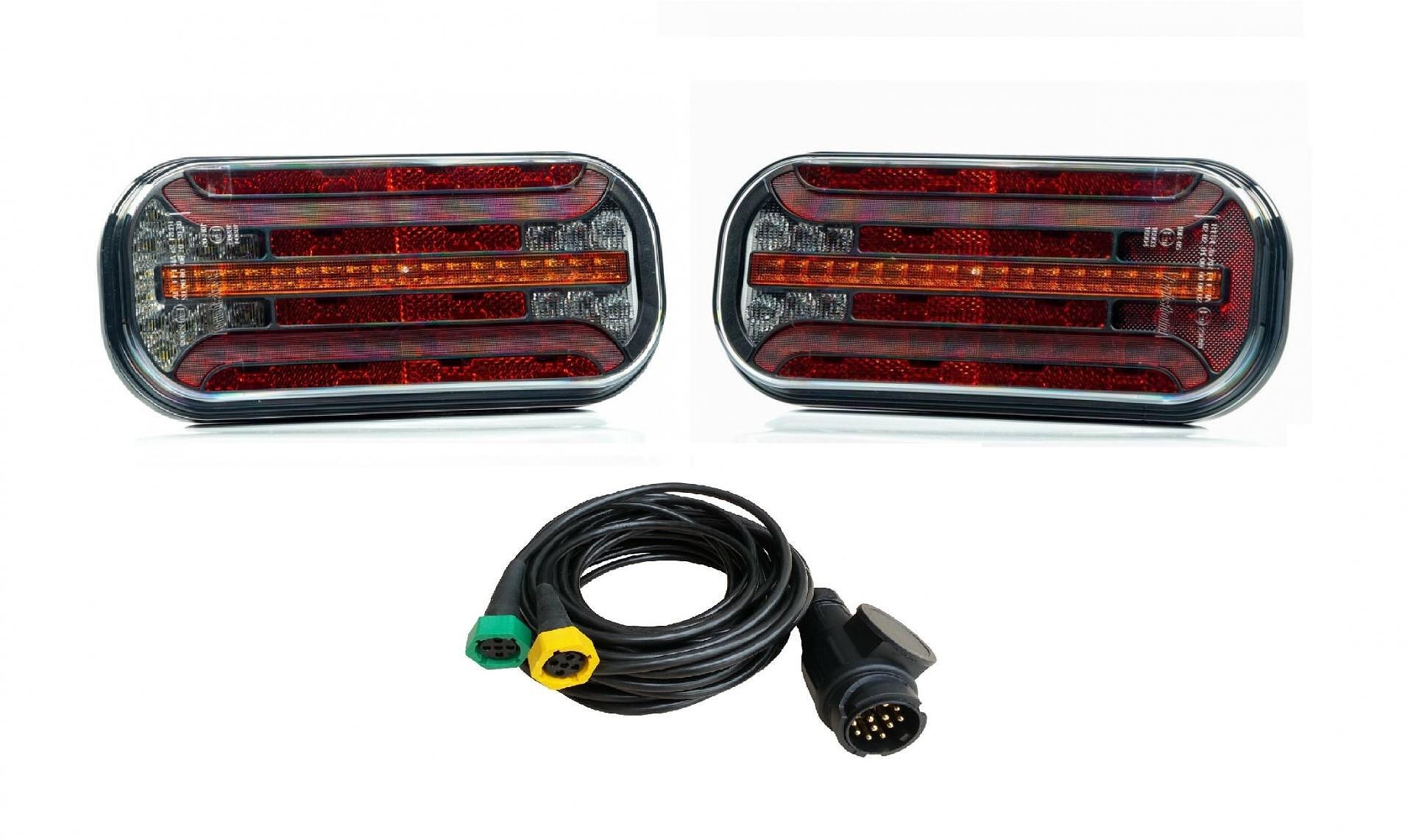 Комплект LED стопове с динамичен мигач + букси и окабеляване, ляв и десен, 7 функции, Е-Мark, 12V-24V