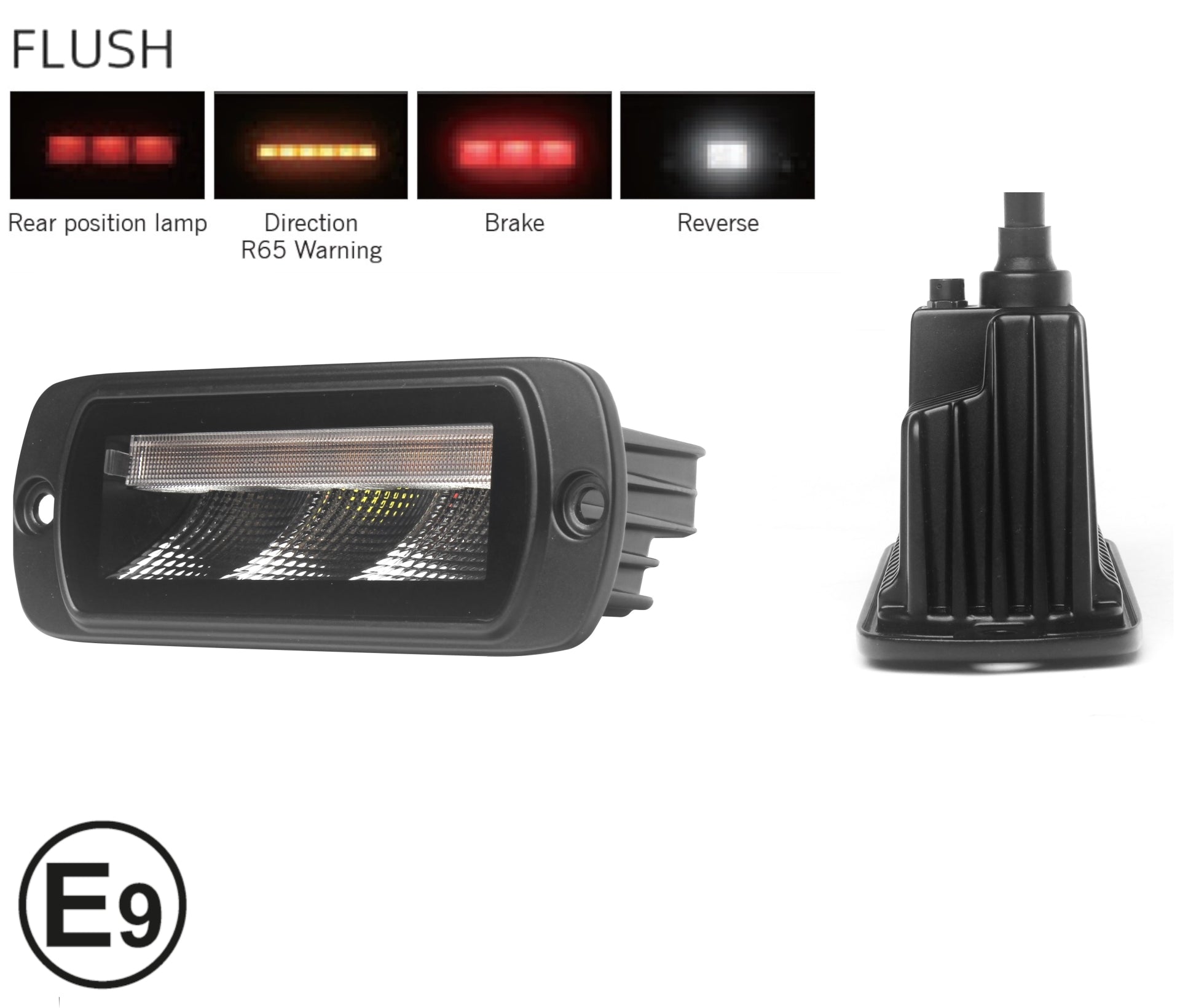 Мултифункционална задна LED лампа за вграждане (flush mount), предназначена за монтаж на камиони, ремаркета, полуремаркета, автобуси, селскостопанска техника и строителни машини.Интегрира няколко основни функции в едно компактно тяло: габарит, стоп, мигач, заден ход и предупредителна светлина.Конструкцията е проектирана за надеждна работа при тежки условия.
