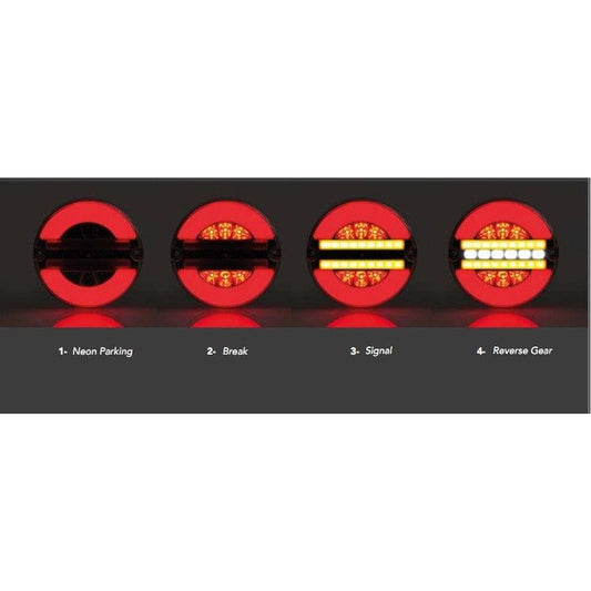 Комплект LED Светодиодни Стопове с Динамичен Бягащ Мигач, Неон Ефект, Кръгли, Тип Хамбургер , Ø13.9см , 3 Функции, Е-Мark, Е9, 12V-24V